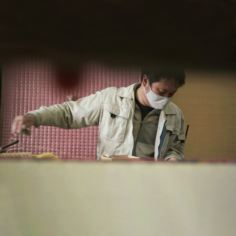 「禅処」で使用する天然い草は、京都で1937年に先々代・中西定吉が「山形屋」より事業継承、屋号を「中西畳商」とあらため、山形屋時代から含めると創業124年以上の歴史をもつ「京畳のスペシャリスト」中西氏厳選のものを使用しております。